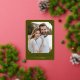 Elegant gold foil wedding thank you card with a unique frame for your photo of choice, modern typography and a olive green background. Customize this wedding thank you template with your names and personal message on the back.