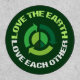 A beautiful environmental activist awareness patch in green with a peace sign and the symbol for recycling around it to show that we need to work together to save the planet with conservation against global warming and climate change. Love the Earth. Love each other.