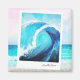 A vibrant depiction of a curling ocean wave in shades of blue is captured within a Polaroid-style frame, set against a tranquil seascape backdrop. The phrase "Love the Ocean" is elegantly inscribed below the wave.