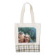 The plaid bottom caught my eye. The ability to personalize it in my own way -- font size, color, further appealed. My wife likes it a lot. The printing is fine, like the bag was created that way.
