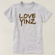 "LOVE YINZ" in black and gold on front of lady's t-shirt - great for any Pittsburgh fan.