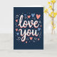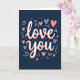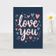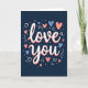 This greeting card centers on the words “love you” in white letters with smooth, flowing lines, set right in the middle of a deep midnight-blue background. A soft coral-pink shadow sits just behind the white text, giving it a gentle lifted look without being too loud. Around the message, small hearts in sky blue and coral pink are scattered like confetti, adding a sweet, romantic feel ❤️. Tiny dots in white and light blue fill in the space, and a few curling white swirls loop around the hearts to keep the layout feeling lively. The dark background makes the lighter colors stand out, so your message feels easy to notice and hard to miss. It’s a simple way to say something important, whether you’re giving it to a partner, close friend, or someone you’re grateful for 🥰. The overall look feels warm and caring, like a quiet “I’m thinking of you” that still lands with real feeling. Share it to help pass along a little Valentine’s Day love and kindness.