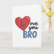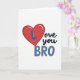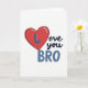 This greeting card shows a big red heart near the upper left, with small white shine marks that make it look glossy. Inside the heart is a large capital “L” in a muted medium blue, standing out like a simple initial. To the right of the heart, the words “ove you” appear in a smooth, connected cursive style in a darker navy-blue, so the full message reads “Love you.” Near the bottom, the word “BRO” is written in thick, all-caps blue letters with a slight 3D look. The background is plain white, which keeps the focus on the heart and the message. It feels meaningful because it mixes affection with an easygoing, friendly tone—perfect for someone you care about like a brother or close friend 🥰.