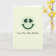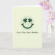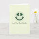 This card features a soft sage-green background with a centered smiling face in deep emerald, creating a calm St. Patrick’s Day look 💚. Instead of regular eyes, two three-leaf clovers sit evenly on the face, giving it a lucky, affectionate twist ☘️. The curved smile is thick and smooth, like a gentle grin shared between close siblings. Beneath the face, the words “Love You Dear Brother” appear centered in an italic serif style, like a neat note left on the kitchen table. The lettering is also a dark green, matching the face so the text and icon feel closely tied together. With lots of open space around the design, the simple layout draws your eye straight from the clover eyes down to the message. The overall setting stays uncluttered and quiet, letting the tender tone come through in the relaxed expression and balanced spacing. The front shows the emerald smiling with clover eyes above the centered dark-green line “Love You Dear Brother” on a sage field, with no other graphics around it.