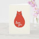 This greeting card features a simple illustration of a red cat shape centered on a soft cream background. The cat looks like a rounded teardrop with two pointed ears, tiny white dot eyes, and a small “w” mouth that gives it a sweet, friendly expression. Thin black whiskers sit on each side of its face, adding a little detail without making the design busy. Across the middle of the cat’s body, the words “love you…” appear in white script that looks handwritten and personal. The text sits right on the cat, easy to spot, and it stands out clearly against the red. A light shadow under the cat and lettering adds a bit of depth, like the design is slightly raised. Overall, it feels warm and caring, perfect for romance or close friendship ❤️❤️