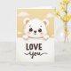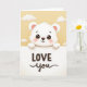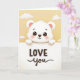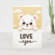 This card shows a fluffy polar bear cub peeking over a white banner at the bottom, with its small paws resting on the edge. The bear sits in the center and looks straight out with big brown eyes, rosy cheeks, and a tiny smile that feels sweet and trusting. Behind it is a soft cream-to-yellow background with a few rounded clouds floating in the sky. The colors stay gentle, mostly white and warm beige with a touch of peach in the ears and cheeks, which keeps the mood calm and cozy. On the banner, the words “LOVE YOU” appear in dark brown, with “LOVE” in simple printed letters and “you” in a flowing cursive style. The message sits right under the bear’s face, so it feels like the cub is holding the words out for you to give. It’s a meaningful card for a partner, close friend, or family member because it says a lot with a simple, caring picture 🥰❤️.