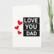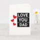 This card has a white background with a simple black-and-red design that feels direct and heartfelt. On the right side, the words “LOVE YOU DAD” are stacked vertically in all-caps white letters, set on three horizontal black rectangles. The letters look like a plain sans-serif style, making the message easy to read and hard to miss. On the left, three red hearts outlined in thin black lines drift downward, each one slightly different in size and angle. The hearts feel like they’re gently floating, which adds warmth next to the strong black shapes. With just a few elements, it says a lot about steady love and appreciation for a dad, whether you’re near or far. It’s a meaningful card to give when you want your feelings to come through without extra fuss 🥰❤️.
