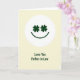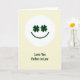 This greeting card features a rich green smiling face centered inside a bright white circle, with two four-leaf clovers forming the eyes for a lucky, affectionate look ☘️. The background is a soft, creamy pale yellow that feels like early spring light, keeping the focus on the simple emblem. The clover “eyes” tilt slightly like a friendly glance, giving the face an easy warmth that suits a close family bond 💚. Below the circle, the phrase “Love You Father in Law” sits neatly on the yellow field in the same deep green as the face. The text is centered and spaced with plenty of breathing room, so it reads clearly without crowding the design. With only white, warm yellow, and forest green, the layout stays calm and uncluttered while still drawing your eye straight to the message. The white circle remains crisp against the yellow backdrop, and the green clover eyes stand out as the most detailed shapes on the card. The smile is a smooth curved line beneath the clovers, all contained within the round white badge.