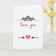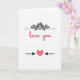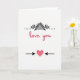 This greeting card features a simple white background with a black floral decoration centered along the top, with small dotted lines on each side. Just below that, the words “love you” appear in smooth, flowing letters in bright pink. The text sits in the upper-middle area and stands out clearly against the white space. Near the bottom, there’s a rounded pink heart with light shading that gives it a soft, full look. Two thin black arrows point inward toward the heart from opposite sides, drawing your eye right to it. The overall look is calm and focused, putting all the attention on love and closeness 💘❤️.