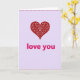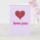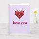 This card features a large crimson heart centered on a soft lavender background, filled with intricate white cutout-style patterns of curling flowers and leafy vines that feel like a careful embrace ❤️. The heart’s detailed lace-like interior draws your eye inward, like two people leaning close to share a quiet moment. Beneath it, the words “love you” sit in a strong magenta sans‑serif style, standing out clearly against the pale lilac field. The text is placed low and centered, giving the heart plenty of space to lead the scene while the message follows like a gentle afterthought 🥰. Along the top and bottom edges, tiny crimson hearts form neat border rows that frame everything with a steady rhythm. The mix of lavender, red, and magenta creates a warm contrast that reads as affectionate without being sugary. Small crimson hearts repeat in even spacing at the top and bottom, enclosing the central heart and the magenta “love you” on the lilac background.