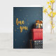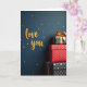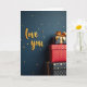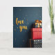 This greeting card shows a deep indigo background with a cozy still-life scene that feels calm and romantic. On the left, the words “love you” appear in glittery gold cursive lettering, standing out clearly against the dark color. On the right, there’s a neat stack of three gift boxes: a dark blue one on top with gold snowflake shapes and a shiny gold ribbon tied into a big bow. Beneath it sits a red box dotted with scattered gold spots, and the bottom box is dark blue with a gold crisscross pattern. Small gold dots and tiny starburst shapes are sprinkled around the card like little sparks of light. The mix of deep blue, red, and gold, along with the gentle lighting, makes it feel thoughtful and close, like you’re saying “I’m thinking of you” without needing many words 🥰. It’s a sweet choice for a partner, a close friend, or anyone you care about, and it ends on a simple note that’s easy to share ❤️—happy sharing of Valentine’s Day feelings.