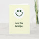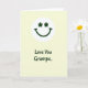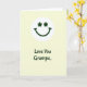 This card features a white circular badge near the top center with a sweet smiling face that feels like a warm nod between close family 💚. Instead of dot eyes, the face uses two matching dark forest-green flower-like asterisks, giving it a gentle, affectionate look. A wide curved smile in the same deep green sits below, like it’s quietly grinning at someone it cares about. The badge floats on a soft buttery pale-yellow background that reads like late-afternoon sunlight. Beneath the face, the words “Love You Gramps” appear centered in dark green, placed in the lower half as the main message. The lettering is smooth and flowing, like a careful note written with extra attention. The simple palette of pale yellow, white, and rich green keeps everything calm and cozy, with a little ☘️ tucked into the overall St. Patrick’s Day feel. The green text sits directly under the circle, with plenty of open yellow space around it and the smiling emblem above.
