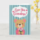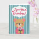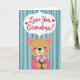 On the front of the card is a tan teddy bear with rosy cheeks, smiling softly as it holds a small bouquet of white daisies with pink centers. The bear wears a bright fuchsia sweater that stands out against the rest of the scene. Behind it, there’s a muted aqua curtain with gentle vertical folds, giving the background a calm, cozy feel. Above the bear, a white cloud-shaped speech bubble contains the words “Love You Grandma!” in a casual handwritten look. The letters are vivid pink, and two small hearts sit near the message, tying in with the sweater’s color ❤️. It feels meaningful because the bear’s simple gift of flowers and kind expression say “I’m thinking of you” in a sweet, caring way 🥰.