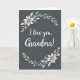 This greeting card centers on the words “I love you, Grandma!” set in flowing white lettering that feels like a gentle whisper of affection ❤️. The message sits prominently in the middle, standing out against a deep, calm background in the range of charcoal green or dark teal. In the upper left corner, a soft floral cluster leans inward as if offering a quiet embrace, with off-white petals and creamy leaves. A matching botanical arrangement rests in the lower right, balancing the layout and giving the design a close, companionable symmetry 🌼. The flowers have layered petals with a subtle raised look, and each bloom is warmed by a golden-yellow center that draws the eye. Fine leaf veins add texture and care, like a small detail someone would notice when holding the card close. The cool background, white message, and creamy florals frame the golden centers in the opposite corners, upper left and lower right.