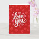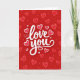 This card shows a deep red background with the words “love you” written large in smooth, flowing white letters across the center. The lettering has a gentle curve and a slightly raised look, so it stands out clearly against the red. Around the message, hearts are scattered like confetti, with a mix of styles and sizes. Some hearts are solid red with a thin white outline, while others are soft pink with a darker red outline that gives them a layered feel. Small white hearts are sprinkled in between, adding extra little points of light across the design. It feels romantic and affectionate without needing anything complicated, making it easy to give to a partner or someone you care about 🥰. Share it to help express your Valentine’s Day feelings with a simple “love you” and a little extra warmth ❤️.