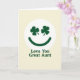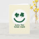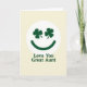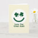 This card features a friendly smiling face centered inside a white circle, with two dark emerald shamrocks for eyes and a matching curved smile that feels like a wink of affection ☘️. Set against a soft cream background, the simple layout leaves plenty of breathing room so the green details stand out without crowding the page. The shamrock “eyes” sit evenly spaced, giving the face a gentle, attentive look, like it’s gazing fondly at someone close. Beneath the circle, the words “Love You Great Aunt” are placed on a single line in deep green, using a sturdy sans‑serif style that matches the smile. The text sits centered under the emblem, creating a tidy top-to-bottom flow that’s easy to read at a glance. With the calm cream backdrop and the rich green accents 💚, the design feels like a quiet little moment of closeness shared between family. The white circle forms a clear frame around the face, and the shamrocks’ three-leaf shapes are crisp and symmetrical within the round border.