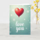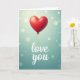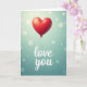 Designed with a single red heart balloon in the center, this card keeps the focus on love right away 💘. The balloon looks shiny and rounded, with bright light spots that make it feel like it’s floating. A thin red string hangs down from the balloon and leads your eye toward the words below. Under the balloon, the text reads “love you” in smooth white cursive letters, placed near the lower middle of the card. The background fades from a light mint green near the top to a deeper teal toward the bottom, giving it a calm, dreamy setting. Soft, blurry circles of light are scattered around the background like gentle glow spots, adding a sweet, cozy feel ❤️.