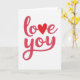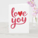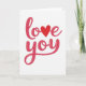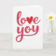 This greeting card features the words “love you” centered on a plain white background. “Love” sits above “you,” and the letters flow in a smooth, connected style that feels like a note written from the heart. The lettering is magenta-pink with a soft shine that makes it look slightly raised. A bright red heart takes the place of the “o” in “love,” standing out right in the middle. The simple layout and lots of white space keep your eyes on the message and make it feel direct and sincere. It’s a sweet choice for a partner, close friend, or anyone you care about, because it says what you mean without needing extra words 🥰. The colors and heart give it a romantic touch while still feeling easy and honest ❤️.