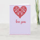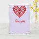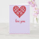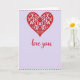 This greeting card features a large crimson heart filled with curling vines, tiny blossoms, and leafy details that feel like they’re leaning toward each other in a quiet, romantic way 🥰. Inside the heart, small touches of fuchsia and warm gold add a jewel-like glimmer, as if little drops of light are caught in the floral lines. The background is a soft lavender wash that gives the red heart plenty of space to stand out without feeling harsh. Centered beneath the heart, the words “love you” appear in flowing red lettering, placed low enough to feel like a gentle whisper under the main image ❤️. Bright red polka dots run in neat rows along the top and bottom edges, creating a cheerful frame that keeps the layout balanced. The contrast between the detailed heart and the calm background makes the scene feel intimate, like a close-up moment shared between two people. The heart’s lace-like interior shows intertwining stems, petal shapes, and small leaf clusters, all contained within a smooth red outline.