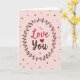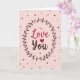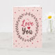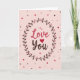 This card features the words “Love You” centered on a soft pastel pink background. “Love” is written in a rosy pink, and “You” appears in a warm brown, with the “o” replaced by a deep red heart ❤️. The lettering looks like smooth, flowing hand lettering, making the message feel gentle and close. Around the words is a simple wreath made of thin brown branches, dark brown leaves, and small pink berries that curve like an embrace. Tiny dots in shades of pink and brown, plus a few small hearts, are scattered near the edges to add a light, happy touch 🥰. The overall look is calm and sweet, and it feels meaningful because it says what you might struggle to say out loud. It’s a thoughtful way to show love or close friendship and share Valentine’s Day sentiments.