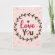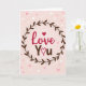 This Valentine's Day card features the words “Love You” right in the center, making the message easy to notice 🥰. “Love” is written in a flowing red letter style, and a filled red heart sits above it like a little accent. Just below, “You” appears in a simple brown letter style, with the “o” replaced by a small heart outline. A ring of dark brown leaves forms a wreath around the words, with tiny round dots tucked between the leaves. The background is a soft blush pink that fades lighter toward the middle, and small hearts in pale pink and white float around like confetti. It feels sweet and close, like a quiet way to say you care without needing a long note ❤️. It’s a lovely choice for sharing Valentine’s Day sentiments with someone special.