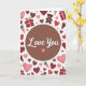 This greeting card features a soft brown oval in the center with the words “Love You” in white, with a tiny pink heart tucked just beneath the lettering 🥰. Around it, a bright white background is sprinkled with classic Valentine icons that feel like they’re floating in a gentle, cozy confetti. Hearts in crimson, blush pink, and chocolate brown appear in different sizes, each with a slightly glossy, candy-like shine that makes the scene feel sweet and affectionate ❤️. Small magenta gift boxes with neat bows are scattered between the hearts, adding little hints of giving and sharing. Chocolate-brown teddy bears pop up here and there, each holding a small pink heart close to its chest as if offering it to someone special. A few cone-shaped treats, like bouquet-style candies or carrot-shaped sweets, fill in the open spaces and keep the layout lively. The “Love You” text sits centered inside the oval, while the hearts, bears, gifts, and treats are spaced all around it on the white field in pink, red, brown, and magenta tones.
