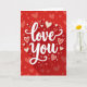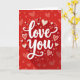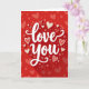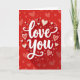 This card shows a deep crimson red background filled with faint heart shapes that sit softly behind the main design. In the center, the words “love you” appear in white, flowing cursive-style lettering, placed large and easy to read. A long shadow falls to the lower right of the letters and a few nearby hearts, giving the front a simple sense of depth. Around the message, you’ll see hearts in a mix of styles: some are thin white outlines, some are creamy beige with dotted stitch marks, and others are red with fine white stitching. The hearts feel like they’re gently floating around the words, which makes the whole scene feel warm and close. It’s meaningful because it says what you might feel but sometimes don’t say out loud, whether it’s for a partner or a dear friend 🥰. The strong red color and the soft heart details help the message land in a sweet, honest way ❤️. Hope it helps you share a little love this Valentine’s Day.