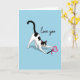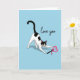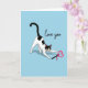 This card shows a black-and-white tuxedo cat stretching with its back arched and front paws reaching forward across a light sky-blue background. The cat’s green-yellow eyes look wide and focused, as if it’s about to pounce. In front of its paws is a bright pink heart-shaped wand toy with a small ribbon tied to it, adding a sweet Valentine touch 💘. A soft shadow under the cat helps it feel grounded, even though the scene is simple and open. Near the top, the words “love you” appear in smooth, flowing cursive letters, standing out clearly against the blue. The cat’s face markings and alert ears make it look curious and affectionate at the same time ❤️. Overall, it feels like a small moment of fun that also says “I care about you,” like a gentle nudge to smile