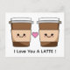 Two cute, kawaii coffees sharing their love for each other with a pink love heat in between them. Below are the words I love you a latte. This is a template you can use as it is or replace with your own message.