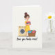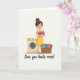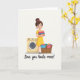 On the front of the card a cheerful young woman with bright eyes stands in a laundry nook, her dark hair in a high bun topped with a pink bow and her yellow dress softly catching the light. She hugs a tidy stack of folded clothes in blues, pinks, and oranges close to her chest, as if saving the warmest pieces for someone special ❤️. To her left sits a cream-colored front-loading washer with a large round door and a simple control strip, keeping the scene grounded in everyday routine. On her right, a woven basket overflows with unfolded garments, adding a cozy sense of shared life and ongoing care. The background stays bright white so the clothing colors and her outfit stand out without distraction. Near the bottom, the phrase “Love you loads more!” is centered in dark lettering beneath the illustration, reading like a sweet note tucked under the scene 🌼. The washer’s circular door is outlined clearly, with a pale gray rim and a small shadow beneath it.