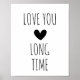 Cute and trendy typography wall art, with the words 'love you long time' in a black text on a white background, and a small black heart in the middle.