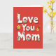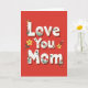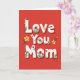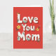 This greeting card features the words “Love You Mom” right in the center, set in large cream-colored letters on a deep red background. The letters have soft shadowing that makes them look slightly raised, giving the message a bit of depth. Small green leaves and tiny flowers in yellow, coral, and light orange curl around parts of the lettering like little accents. Scattered across the cream letters are uneven polka dots in mint green and soft red, adding a cozy, stitched-like feel. The bright red backdrop keeps the whole scene warm and affectionate, like a big hug in card form 🥰. The text looks like rounded, friendly print lettering, and it’s easy to read from a distance. It feels meaningful because it says exactly what many people want to tell their mom, without needing a long note ❤️. Share it to pass along a little extra love for Valentine’s Day.