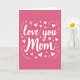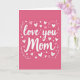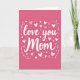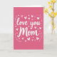 This greeting card features a solid fuchsia background with the words “love you Mom” in large white cursive lettering across the center. The letters look like smooth pen strokes, with gentle curves that make the message feel close and caring. Around the text, you’ll see lots of hearts in different sizes, including solid white hearts, light pink outline hearts, and a few soft blush hearts. Small white dots are scattered between the hearts, adding a light, happy feel without taking attention away from the words. There are also thin curling vine-like lines near the edges of the message that frame it in a simple, sweet way. It feels meaningful because it says what many people want to say out loud, and it does it in a straightforward, loving way 🥰. Whether it’s for your mom or someone who feels like family, it’s a kind reminder that love can be simple and steady ❤️.