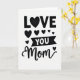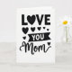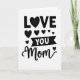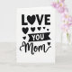 This greeting card features the message “Love You Mom” in a simple black-and-white design with strong contrast. The word “LOVE” sits at the top in large uppercase letters, and the “O” is replaced by a solid black heart ❤️. Below that, a few small black hearts trail downward like a gentle path for your eyes to follow. Across the middle, the word “YOU” appears inside a long horizontal banner in matching uppercase letters. At the bottom, “Mom” is written in a smooth, flowing cursive style, which makes it feel softer and more personal 🥰. A small heart is used as a tiny finishing mark near the end of the word, adding a sweet touch without needing extra detail. It feels meaningful to give because it’s direct, loving, and easy to read at a glance, making your feelings clear. Hope it helps you share your Valentine’s Day sentiments.