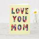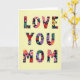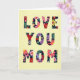 This greeting card features the words “LOVE YOU MOM” in large uppercase letters centered in three rows on a pale yellow background. Each letter looks like a little window filled with flowers, set against a deep navy-blue interior. Inside, you can see pink, red, purple, and bright yellow blooms mixed with small green leaves, packed closely together. Some flowers have light blue or orange centers, and a few tiny white star-shaped blossoms are tucked in between. The text is thick and easy to read, with the letters formed by the floral shapes rather than plain ink. It feels like a sweet way to tell your mom she’s loved, with the garden-like letters suggesting care, time, and attention 🥰. It’s a simple message that still feels special, perfect for showing love and closeness on Valentine’s Day ❤️.