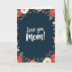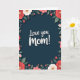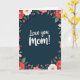 Designed with a deep midnight-blue background, this card centers a warm message that feels like a close hug between friends ❤️. In the middle, the words “Love you Mom!” sit large and easy to read in smooth white lettering with a slight raised look. The text is placed centrally, leaving comfortable breathing room around it so your eyes land there first. Encircling the message is a loose, natural ring of flowers and leaves that leans a little to one side, like a bouquet arranged with quiet affection. Red and coral-pink blooms mix with soft white petals, while rich green foliage and tiny buds tuck into the gaps for a cozy, cared-for feel 🌼. Some of the larger flowers have golden-yellow centers that add small points of light against the dark backdrop. The petals show gentle shading that makes them look softly layered, with the floral border framing the center like a tender embrace. The botanical frame includes red blossoms at the corners, pale white flowers along the sides, and scattered green leaves curving inward toward the bright white words.