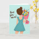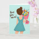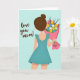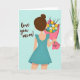 This card shows a young person from behind in a flowing teal dress with small ruffles on the sleeves, her dark hair tied up in a neat bun. She looks like she’s walking forward with purpose, holding up a bouquet as if she can’t wait to give it. The flowers are a mix of yellow, white, and soft blue, wrapped in bright hot pink paper for a happy splash of color. On the pink wrap, the words “for you!” appear in simple lettering near the center of the bouquet. On the left side of the light blue background, the message “love you mom!” is written in a flowing, cursive-style look that feels warm and direct. The soft pastel setting keeps everything gentle and calm, like a quiet moment of care and thanks. It feels meaningful because it shows love through a small, thoughtful gift and a few honest words 🥰❤️. Hope it helps you share Valentine’s Day feelings in a kind, heartfelt way.