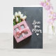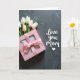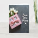 This greeting card shows a blush pink gift box in the center, wrapped with a shiny satin ribbon tied into a neat bow. Beside it sits a small bunch of white tulips with fresh green stems, angled toward the upper left like they were just set down with care. The background is a dark gray marble surface with thin white veins running through it, giving the scene a calm, cozy setting. On the right side, the words “Love you Mom” appear in smooth, flowing white cursive-style letters, with a small white heart next to the message. The soft lighting makes the ribbon gleam a little and keeps the whole scene gentle and warm ❤️. It feels meaningful because it pairs a simple gift and fresh flowers with a direct message that’s easy to say but important to hear. This is a sweet way to share your Valentine’s Day feelings with someone you love 🥰.