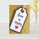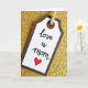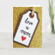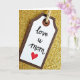 This greeting card features a close-up gift tag set at a gentle diagonal, drawing your eye right away. The tag is bright white with a deep brown border, and a rustic twine loop threads through a matching brown ring at the top, giving it a cozy, caring touch 👩. Centered on the tag, the words “love u mom” appear in black, flowing lettering that feels intimate and close. Just beneath the text sits a small, symmetrical red heart ❤️, like a quiet cue of affection between giver and receiver. Behind the tag, a field of shimmering gold glitter fills the scene, adding a celebratory glow without stealing attention from the message. The glitter is softly out of focus, turning into gentle sparkles that frame the tag like warm candlelight. The smooth paper, rough twine, and scattered gold flecks create a rich mix of textures across the image. The red heart rests directly under the black words on the white tag, outlined by the dark brown border against the blurred gold background.