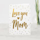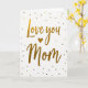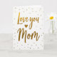 This card features a white background with the words “Love you Mom” centered in flowing, decorative lettering that feels tender and close ❤️. The letters are filled with a shimmering gold texture, like metallic foil catching the light. A small gold heart sits neatly between the words, adding a gentle, affectionate pause in the message. The text is arranged in two lines, with “Love you” above and “Mom” below, keeping the focus right in the middle. Around the phrase, scattered gold dots in different sizes drift like confetti, giving the scene a soft celebratory touch 🌼. The open white space makes the gold elements stand out, like a warm note left on a bright tabletop. Tiny circular sparkles cluster more densely near the top and sides, with a few dots trailing down around the lower word.