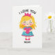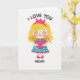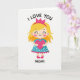 This card shows a sweet, stylized young girl standing in the center on a white background, with blonde hair and a closed-eye smile. Her cheeks are rosy pink, and her expression feels calm and loving, like she’s giving a quiet thank-you 🥰. She wears a bright fuchsia crown, a turquoise dress with small white polka dots, and a fuchsia scalloped trim along the bottom. Matching fuchsia shoes peek out below, and she holds a large fuchsia heart close to her chest ❤️. At the top, the words “I LOVE YOU” curve in black, thick cursive-style letters above her head. Near the bottom, “MOM!” appears in black capital letters under her feet, making it clear who the message is for. It feels meaningful because the simple pose and the heart say a lot without needing extra details, making it easy to give with real affection. Hope it helps you share your Valentine’s Day feelings in a warm, caring way.