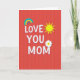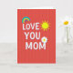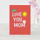 This card features the words “LOVE YOU MOM” in large white uppercase letters centered on a warm red background, with a soft shadow that makes the lettering stand out. The red field has fine vertical ridges, giving it a textured paper look that feels cozy and close, like a hug ❤️. Above the first word sits a small rainbow-like arc made of three bands in turquoise, yellow, and deep purple, adding a gentle, caring accent. Near the upper right, a bright yellow sun with pointed rays brings a cheerful glow, like a warm morning shared together. The layout keeps the message front and center, with the decorations spaced around it so the eye moves easily across the design. A white flower with many rounded petals and a yellow center rests at the lower right, tucked near the final word like a thoughtful little gift 🌼. The overall scene is simple and affectionate, with the red texture, sunny icon, and small arc framing the centered text. The flower’s white petals curve outward against the red ridged background, with its yellow center clearly visible.
