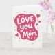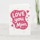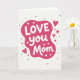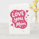 This card shows a big fuchsia-pink shape in the center, rounded and organic like a soft speech bubble. Inside it, the words “LOVE you Mom” appear in white, rounded sans-serif letters, with “LOVE” in all caps and a slight shadow that helps the text stand out. The background is white with scattered grey polka dots in different sizes, giving it a gentle, airy look. Small fuchsia hearts sit inside the pink shape and also float across the card, with several gathered along the right side. The overall feel is sweet and close, like a simple hug in card form 🥰. It’s meaningful to give because the message is direct and easy to read, and the hearts quietly reinforce how much you care ❤️.