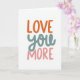 This greeting card keeps things simple and sweet, with the message “LOVE you MORE” as the main focus. The words are stacked in three lines down the center, making it easy to read at a glance. “LOVE” is in warm orange, “you” is in a soft teal, and “MORE” is in a gentle blush pink. The letters are rounded and friendly, using a simple sans-serif style that feels modern and approachable. The background is plain white with no extra objects or characters, so all your attention stays on the message. Overall, it gives a warm, caring feeling that fits romance, affection, or close friendship ❤️💌. Share it with someone special and pass along a little extra Valentine’s Day love 🍫.