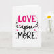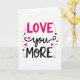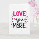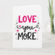 This greeting card puts the message “LOVE you MORE” front and center in a tall, stacked layout. “LOVE” sits at the top in rounded pink letters that feel friendly and upbeat. Just below it, “you” is written in flowing black cursive, with small hot pink hearts nearby that act like cute little accents 💘. At the bottom, “MORE” appears in strong black letters that balance the bright pink above. The background is plain white, so the pink and black colors stand out clearly. Around the words, there are a few small black stars and pink dots scattered like confetti, giving the design a fun, celebratory look ❤️.