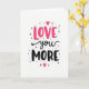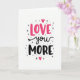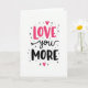 This Valentine's Day card features the message “LOVE you MORE” centered on a plain white background. “LOVE” sits at the top in thick, rounded letters colored hot pink, with a small pink heart just above it. The word “you” appears in the middle in a loose, hand-drawn black style that looks like quick pen writing. “MORE” is placed at the bottom in chunky black letters, and a second pink heart sits just below it to match the one at the top. Around the words, there are tiny black marks like little stars, plus signs, and dots, mixed with a few small pink ones, like scattered confetti. The simple layout and strong pink-and-black contrast make the message feel direct, sweet, and easy to read 💘❤️. Share it with someone special and pass along a little extra love this Valentine’s Day 😘.
