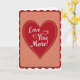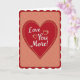 This Valentine's Day card centers on a large deep red heart that sits right in the middle. Inside the heart, the message “Love You More!” is written in white script, and it’s easy to read at a glance. The two “o” letters in “Love” and “You” are replaced with small gold heart shapes, which adds a sweet little detail. A thin gold outline and a dotted gold border frame the main heart, giving it a layered look. Behind it, the background is a soft peachy pink filled with repeating gold heart outlines that stay subtle and supportive. Around the whole design is a scalloped red edge that feels a bit like a stamp border, bringing everything together. It’s a warm, romantic design that feels perfect for a partner, close friend, or someone you care about ❤️