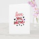Designed with a simple white background, this card puts the message “love you more” right in the center in three stacked lines. The word “love” is written in a soft coral pink, “you” shifts into a deeper red, and “more” finishes in a dark ruby red. The letters look like smooth, flowing handwriting, making the message feel close and caring 💘. Small heart shapes are scattered around the words, mostly in black, like little accents. One heart stands out in a deep indigo purple, tucked in among the black ones for a sweet surprise. The whole design feels romantic and direct, without any extra clutter