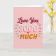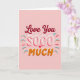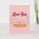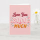 “Love You” sits near the top in deep crimson, written in a flowing cursive-style lettering that feels tender and romantic. In the center, “SOOO” appears much larger in scarlet with a white outline, and the long O’s are interrupted by a tiny red heart that adds a sweet little surprise ❤️. Underneath, “MUCH” is placed at the bottom in a warm ochre color, slightly slanted, giving the message a steady finish. Around the word “SOOO,” small arcs and dots in teal, soft pink, and earthy brown spread outward like little bursts of excitement. The overall look is simple and upbeat, like you’re saying it out loud with a smile.