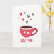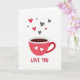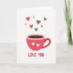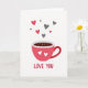This greeting card shows a coral-red mug filled with a dark hot drink, with tiny bubbles floating on top. Two white heart shapes sit on the front of the mug, like a small reminder of love. Above the cup, a trail of hearts rises into the air, mixing coral-red and charcoal grey shapes that feel like warmth drifting upward. The background is plain white, so the reds and greys stand out and the whole scene feels calm and focused. Near the bottom, the words “LOVE YOU” appear in red, written in a casual, slightly curly letter style. It’s a simple picture, but it still feels close and caring, like sharing a cozy moment with someone you miss 🥰. This card works well for romance or friendship because it says a lot without needing many details ❤️. Hope it helps you share your Valentine’s Day feelings in a kind, easy way.